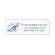 An elegant minimalist return address label featuring your monogram initial letter R in script typography. Personalise with your name and address in a simple dark navy blue typography.