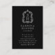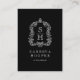 This elegant vertical business card design features an ornate vintage crest in white on a black background, framing a pair of monogram initials in open serif font. Add your name, title and (on the reverse side) contact information in white on black.