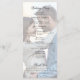 This elegant black and white wedding program features an ornate crest at the top with the monogram initials of the bride and groom in fancy formal script font, and a faded photo of the happy couple on the back behind the wedding party text.