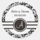 Elegant Monogram Damask Save The Date Wedding Stickers. Make a lasting impression with this Elegant Monogram Damask Save The Date Wedding Sticker . There is a stripe along the sticker and a circle with an elegant monogram on it. The beautiful black and white damask pattern background adds style and finesse. Designed by Olympia. Classic and sophisticated yet contemporary at the same time. Design available in several colours. Personalise it with your text. You can change text and use it as Thank You stickers or any other use you think.