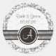 Elegant Monogram Damask Save The Date Wedding Stickers. Make a lasting impression with this Elegant Monogram Damask Save The Date Wedding Stickers . There is a stripe along the sticker and a circle with an elegant monogram on it. The beautiful grey and white damask pattern background adds style and finesse. Designed by Olympia. Classic and sophisticated yet contemporary at the same time. Design available in several colours. Personalise it with your text. You can change text and use it as Thank You stickers or any other use you think.