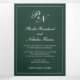 Traditional and classy all in one wedding invitation template with rsvp card and enclosure card attached, making this invitation suite convenient and budget friendly. The wedding invitation has your two initial monogram and your names in an elegant calligraphy inside of a thin border along with your favourite photo on the back. All design elements are in forest green and may be changed to any colour you wish in the design editing tool. The RSVP postcard has your mailing address on the back and your guests simply cut off and mail back to you. NOTE: First class postage is required for the RSVP postcard. Postcard stamps will not be enough postage due to the size. This classic design is perfect for a formal wedding. All-in one invitations are convenient and budget friendly.