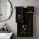 Personalised elegant monogram black gold script name bathroom towel set gold borders on black. Refresh your bathroom decor with a minimalist typographic style.