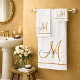Personalised elegant monogram gold script name bathroom towel set gold borders on white. Refresh your bathroom decor with a minimalist typographic style.