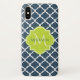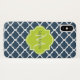 An elegant navy blue quatrefoil patterned Barely There iPhone X Case with a scalloped badge in a vibrant spring green that you can personalise by adding your name and monogrammed initial to. This is part of the Sailor Blue and Lime Punch Spring Collection.