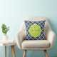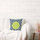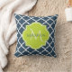An elegant navy blue quatrefoil patterned square throw pillow with a scalloped badge in a vibrant spring green that you can personalise by adding your name and monogrammed initial to. This is part of the Sailor Blue and Lime Punch Spring Collection.