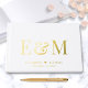 Elegant white wedding guest book featuring your choice of real gold, silver or rose gold foil, your monogram initials in large classic serif typography, your names joined together by a heart and your wedding date. Personalise additional text on the spine.