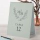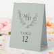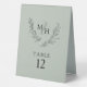 Elegant Monogram Wreath Sage Wedding Table Number Tent Sign... The front and back of our monogram wedding table number sign features an elegant leafy botanical laurel wreath displaying the bride's and groom's initials in romantic serif typography, followed by the numerical table number detail... all on a trendy sage green background. All text on both sides of the sign can be easily revised on the personalisation template with just one entry.