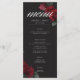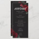 Embrace timeless elegance for your gothic-inspired celebration with our captivating wedding long menu card. A soft black background provides the perfect canvas for a captivating, yet understated bouquet. Imagine a corner arrangement of muted blood red rose blooms, where rich red hues mingle with dark green foliage. This ethereal design exudes quiet sophistication, perfect for the bride-to-be seeking a touch of romantic darkness. An elegant, vintage script announces your card, while your details are showcased in a modern font, ensuring they stand out beautifully. This enchanting design creates a truly unforgettable design for your special event, setting the tone for a moody and elegant celebration of love. Created by Simply Farmhouse Press.