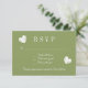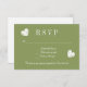 Elegant moss green RSVP wedding response cards for reply. Give your guests a way to respond if they are coming or not to your elegant wedding. This design goes together with wedding reception invitations and other items of a classy matching themed collection set. Customisable text and paper quality. Rustic love heart symbol design for bride and groom couple. Trendy custom colour themes for marriage. Stylish script typography template. R S V P accepts with pleasure, total number of guests, declines with regret.