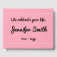 This simple funeral or memorial guestbook features the message "We celebrate your life,", and the personalised name and birth/death dates of the individual who has passed away. It could be used to record fond memories of somebody who has recently passed on.