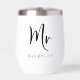 Elegant personalised thermal wine tumbler for a groom or husband to celebrate their wedding or married life featuring "Mr" in a large chic script and your family name in classic serif typography. A matching "Mrs" tumbler is available - message us for the link.