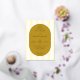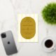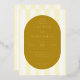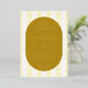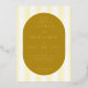 This elegant wedding invitation features a modern, minimalist design with a mustard yellow oval centerpiece surrounded by vertical white and pale yellow stripes. The layout is symmetrical and centred, creating a balanced composition that highlights the clean lines and solid colours of the digital illustration style. Typography plays a key role, using serif fonts for a formal touch and varying weights to emphasize important details. The warm colour palette and classic typefaces convey a sophisticated and celebratory mood, making it perfect for a stylish and memorable wedding event.