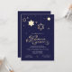 Elegant Hanukkah party invitation features a navy background with sparkling gold Stars of David hanging from the top at various lengths. White snowflakes falling from the top of the card along with a flourish font making this a perfect card for your house or Hanukkah party. Please note, no real foil will be used in this card.