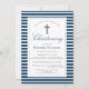 A Classic with a touch of modern Christening Invitation for boys. The design features a stripes background in blue navy and white, a beautiful grey silver cross, "Baptism" in classic script typography, and all information about the event in dark grey. Customise with the template fields provided or click customise further for more editing option.