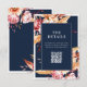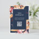 Modern fall wedding enclosure cards with elegant boho fall floral accents of dahlia flowers and autumn botanical leaves, minimalist typography design on navy blue background. Add your own personalised QR code with custom wedding website url.