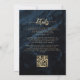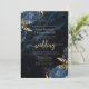 This elegant wedding invitation features blue floral bouquets set off with gold faux foil greenery in two corners, on a background image of navy blue watercolor agate. The customisable text combines gold-coloured serif, italic and handwriting fonts. The reverse side provides space for wedding details, along with a QR code guests can scan to visit your website and RSVP, which saves the cost of printing and mailing separate RSVP cards.