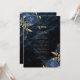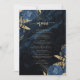 This elegant wedding menu features blue floral bouquets set off with gold faux foil greenery in two corners, on a background image of navy blue watercolor agate. The customisable text combines gold-coloured serif and handwriting fonts. The reverse side features a matching navy blue and gold floral and agate design.