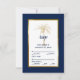 Provide your guests to reply to your wedding invitation with this elegant RSVP card featuring modern script, navy blue and gold text including an artistic palm tree and metallic gold frame on the front of the card. A navy blue background is on the front and back.