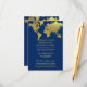 Wedding information card features a world map border design. Elegant navy blue and faux gold foil colour scheme.