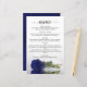 These beautiful wedding menus are simple, elegant, and stylish while still being budget friendly and affordable. They feature a classy and glamourous design with a script calligraphy title and a single navy blue coloured rose reflecting in a pool of water with waves and ripples. The back is a beautiful, marbled dark blue colour with the names of the couple and wedding date at the bottom.