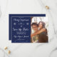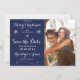 Elegant navy blue Save The Date Christmas cards with snowflakes and changeable white text and photo - you can add your photo, names and wedding date