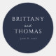 This Classic Round Sticker features a sophisticated navy blue background with elegant white typography, creating a timeless and formal aesthetic. The design includes the names "Brittany and Thomas" in a stylish serif font, accompanied by a date below, suggesting it is perfect for wedding-related purposes or as a personalized label. The clean layout and refined color palette evoke a sense of celebration and class, making it ideal for special occasions like weddings or anniversaries.