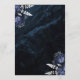 This elegant wedding menu features navy blue floral bouquets set off with silver faux foil greenery in two corners, on a background image of navy blue watercolor agate. The customisable text combines silver grey serif and handwriting fonts. The reverse side features a matching navy blue and silver floral and agate design.