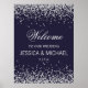 Wedding welcome banner / sign with elegant sparkling silver glitter on a navy blue background.
