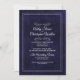 This elegant wedding invitation features a rich navy blue textured background with refined white typography for a timeless and formal presentation. The front design highlights the couple’s names in graceful script, accented with delicate ornamental flourishes and balanced serif text for ceremony details, creating a classic and sophisticated layout. The coordinating back showcases a clean monogram framed by a double-line border, adding a polished, cohesive finish. Perfect for traditional, formal, and black-tie weddings, this invitation sets an upscale tone and pairs beautifully with a coordinated wedding stationery suite.