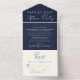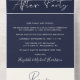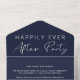 Elegant elopement or wedding announcement and post-wedding reception all in one invitation with light cream typography against dark navy blue background. "Happily Ever After Party" is written in a mix of simple typography and a modern script. A tear away RSVP postcard provides a convenient and eco-friendly and envelope-free response from your guests.