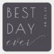 This elegant wedding sticker features a modern, minimalistic design with a dark navy or charcoal grey background. The layout is centred and balanced, showcasing the phrase "BEST DAY ever" in a mix of bold sans-serif and flowing cursive fonts, creating a dynamic yet harmonious look. The colour palette consists of crisp white text that stands out against the sophisticated backdrop, conveying a mood of celebration and joy. Perfect for marking special moments, this sticker combines simplicity with style, making it an ideal choice for those seeking a memorable declaration on their big day.