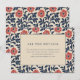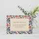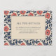 This wedding enclosure card features a sophisticated design with a central beige rectangle framed by a navy blue border, surrounded by a vibrant floral pattern of red-orange flowers and deep navy leaves. The layout is clean and structured, creating an elegant and inviting atmosphere perfect for conveying important details about your special day. The typography uses a bold serif font for the title "ALL THE DETAILS," while the body text offers customizable information in a lighter weight, ensuring clarity and readability. Ideal for weddings, this card combines modern aesthetics with classic elements to enhance your event's presentation.