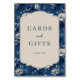 This elegant wedding tabletop sign features a sophisticated navy blue background adorned with a repeating pattern of detailed white roses and green foliage, creating a classic and timeless look. The central frame is a creamy off-white colour, providing a clean backdrop for the bold serif typography that reads "Cards and Gifts" followed by "Thank You," conveying gratitude in a refined manner. The balanced layout and harmonious design make it perfect for expressing appreciation at your special event.