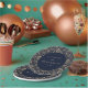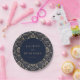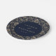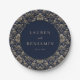 This elegant wedding plate features a sophisticated navy blue background adorned with intricate, repeating floral patterns in a luxurious damask style. The central circular design showcases customisable text in a classic serif font, framed by a thin double border for a polished look. The overall aesthetic is timeless and refined, perfect for celebrating your special day with an air of sophistication and natural elegance. Ideal for formal occasions, this design combines traditional motifs with modern clarity to create a memorable table setting.