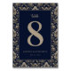 This elegant wedding table card features a sophisticated design with a deep navy blue background and intricate beige floral patterns framing the edges. The central focus is a large, stylish number "8" in a serif font, complemented by cursive script for "table" above and simple sans-serif text below for customization. The classic layout exudes vintage charm, perfect for formal celebrations, creating an atmosphere of refined sophistication and timeless elegance.