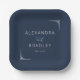 This elegant wedding plate features a minimalist design with a deep navy blue background, creating a sophisticated and modern look. The layout includes clean lines and geometric accents in an Art Deco style, enhancing the formal atmosphere. White text is arranged vertically, showcasing two names connected by a cursive "and," while smaller lettering displays the date below. The monochromatic colour palette emphasizes clarity and focus, making it perfect for celebrating your special day with understated luxury.
