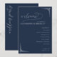 This elegant wedding program features a sophisticated navy blue background with white text, creating a striking contrast. The layout is clean and modern, with a mix of cursive and serif fonts that add a touch of formality and charm. Decorative geometric shapes in the corners enhance the minimalist design, while the structured schedule lists guide guests through the ceremony seamlessly. Perfect for couples seeking a refined and contemporary aesthetic, this program captures the essence of celebration and unity.