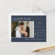 This save the date engagement announcement invitation postcard features elegant calligraphy and simple sans serif typography font with a photo and QR code on a navy blue background with faux gold lines, gold heart ring, and black/white text for a clean minimalist and modern look, which is a beautiful way to tell your guests to inform about your upcoming wedding. Announce to your family and friends you are getting married with this invitation and add a personal touch with beautiful pictures of you and your soon-to-be better half. The simplicity of this design adds a touch of elegance to your wedding save the date invitation cards. It works well with many wedding themes and definitely a great addition to your wedding. Just customise the names and wording in a few easy steps and personalise the invitation postcard with your photo of the happy couple and replace the QR Code with yours.