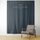 This elegant wedding backdrop features a minimalist design with a deep navy blue background, creating a sophisticated atmosphere. The layout includes clean lines and ample negative space, framed by a thin white border that adds structure. Customizable text elements are presented in bold serif fonts, allowing for personalization of names and dates. The overall style is modern and understated, perfect for formal occasions seeking a touch of refinement.