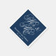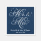 Wedding napkins feature "Mr. & Mrs." in a white calligraphy script font with custom monogram design that can be personalised with the bride and groom's married name and wedding date. Navy blue and white colour scheme.