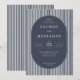 This elegant wedding invitation features a classic design with vertical striped borders in alternating dark and light blue, creating a sophisticated frame around the central oval. The deep navy blue background highlights crisp white serif typography, conveying formality and tradition. Customizable placeholders for names, dates, and locations are seamlessly integrated into the layout, ensuring personalization while maintaining a refined aesthetic. Ideal for formal celebrations, this invitation exudes sophistication and is perfect for setting the tone for a memorable event.