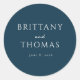 This elegant wedding sticker features a minimalist design with a deep navy blue background and crisp white text. The layout is simple yet sophisticated, showcasing the names in large serif fonts with a cursive "and" connecting them, followed by an italicized date. The typography creates a balanced and formal look, perfect for adding a touch of class to your wedding stationery. Its clean lines and restrained color palette convey a mood of timeless elegance, making it ideal for couples seeking a modern and refined aesthetic for their special day.