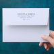 This wedding envelope features a clean, minimalist design with a simple centered layout and ample white space. The color palette is dominated by a deep navy blue text on a plain white background, creating an elegant contrast. Utilizing crisp digital typography, the design employs bold serif fonts for the names and lighter serifs for the address, ensuring legibility and sophistication. The overall mood is formal and refined, making it perfect for official wedding communications.
