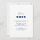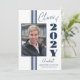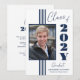 Class of 2025 elegant stylish graduation announcement with navy blue stripes, photo frame, and text on a white background.