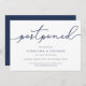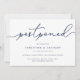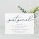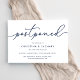 Need to postpone your wedding or change the date? Let guests know with these simple and elegant wedding postponement announcement cards. Chic navy blue and white design features "postponed" at the top in hand lettered calligraphy script, with your names and new date beneath. Adjust the wording and level of detail as needed. As shown, sample text directs guests to your wedding website for additional information.
