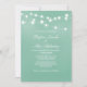 Trendy neo mint / teal watercolor wedding invitations with white string lights and an elegant script font.