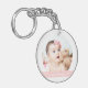 Trendy, classy personalised keychain for a baby girl with a white frame with a round opening for a custom horizontal photo, and a curved pink band on each side on which appears the name or names of the girl and her date of birth in an elegant script font / typography. Note that you can choose to buy this keychain single-sided.
