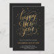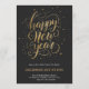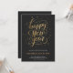 Elegant New Year's Eve invitation with gold script saying "Happy New Year" on a black background, with event details in gold beneath.