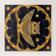 Stylised illustration of a night owl perched on a branch surrounded by gold and blue patterns, evoking a magical and mystical ambiance, ideal for decorative or artistic purposes.